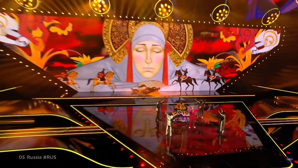 There’s another moment in the staging of the performance that alludes to Russia’s unique history, and the unique nature of its multinationality. As Manizha sings the lines “Борются, борются / Все по кругу борются, да не молятся” (“Fighting, fighting / everyone around is fighting but not praying”), images of warriors on horseback running toward each other appear on the screen behind her while a woman looks sorrowfully over them from above. If you look closely, the warriors coming from the right side seem to be Mongols while those from the left look like medieval Russian knights (or “boyars”).