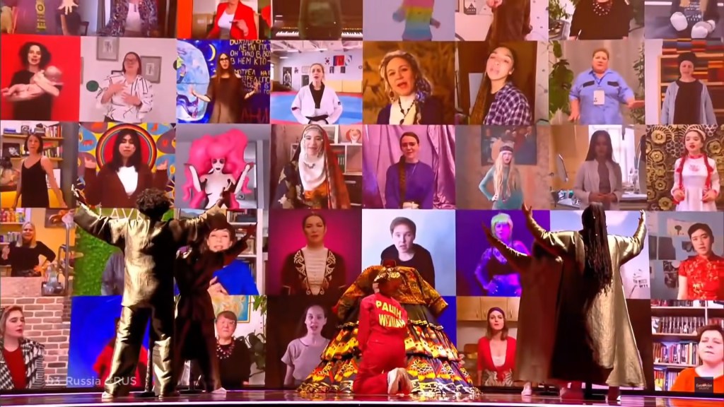 The performance ends with Manizha singing to a wall of Russian women. Notably, the women in the screen are clearly a diverse bunch, coming in all shapes, colors, sizes, ages, professions, sexualities, and gender identities. These aren’t just the white, sexy Russian supermodels and bumbling babushki we see in Western media. These aren’t just the white, straight, behaved women that traditional Russian society deems acceptable. The real Russia isn’t just what we see in movies and it isn’t just what an increasingly nationalist and traditionalist government wants it to be. The real Russia is complicated, multifaceted, and diverse. These diverse Russian women are ready to break free from the constraints of both traditional gender roles and xenophobia, and they are ready for change. These Russian women, as Manizha proclaims triumphantly, are the change.