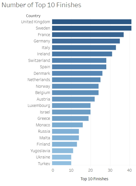 And if we take a look at the total number of Top 10 finishes, the UK and Sweden are tied at 41 (!!).