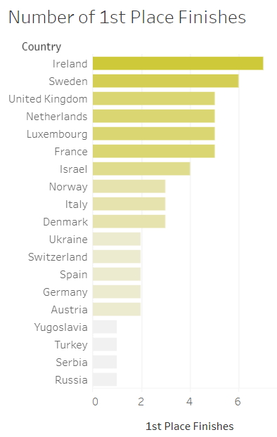 If we’re measuring who is “the best,” we should have a definition of what that means. At the most basic level, we can simply look at who has won the contest the most times, and that prize goes to Ireland, with seven wins.