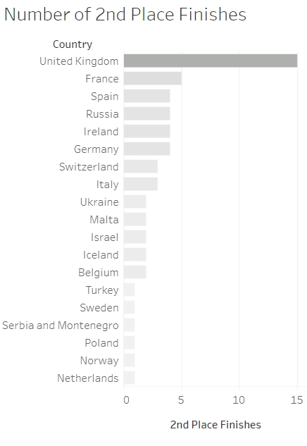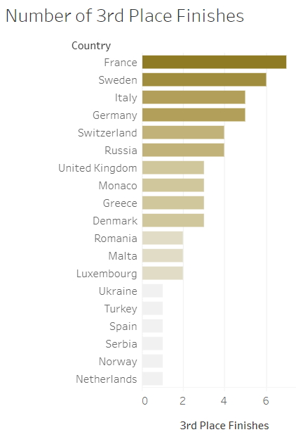 Ok, let’s expand our scope a little and look at other placement metrics. The UK has by far the most 2nd place finishes with 15 total. France takes the lead in 3rd place finishes with 7 total.
