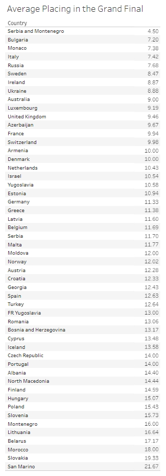 Ok, so just the number of wins and the number of top 10 placings and the number of qualifications doesn’t work. What if we then look at how a country does, on average, in the Grand Final? The table below shows us every participating country’s Average Placing in the Grand Final.