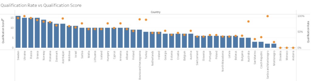 That exposes the obvious flaw in this metric – there is an advantage for countries that have only competed a few times but done very well. Up until this year, Australia also had a 100% qualification record, but is it really fair to put them on par with Ukraine when the former had competed 5 times and the latter 15 times? And, technically speaking, Sweden has qualified for the Grand Final more times than Ukraine, but they did miss out one year and thus have a lower qualification rate.