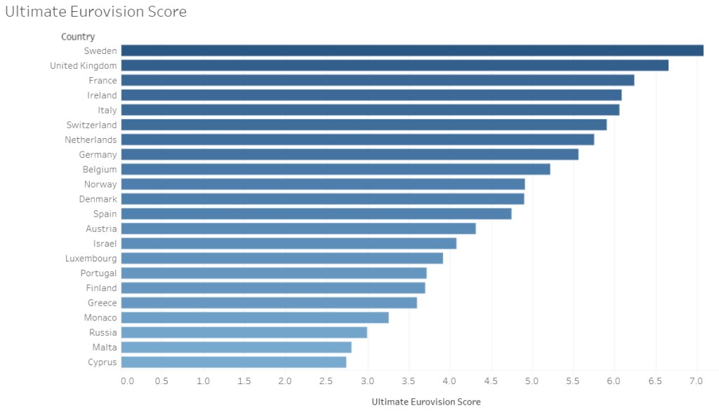 And the winner is – SWEDEN! With 60 years of participation and an average Grand Final placing of 8.47, the Swedes come out ahead of the UK, France, Ireland, and Italy.