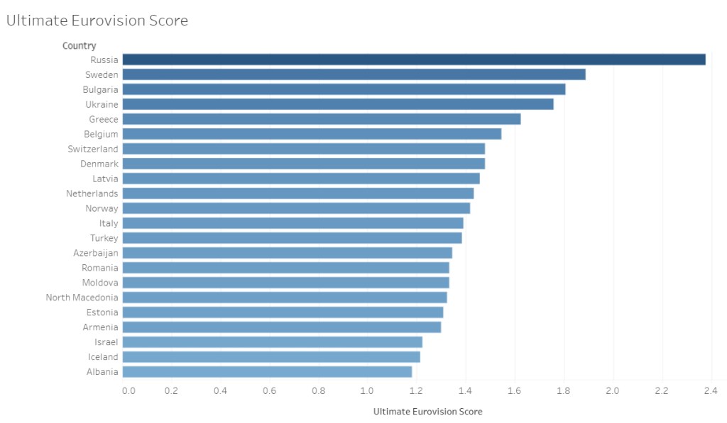 To compensate for NQs and the fact that countries have continuously been added to the competition over the years, let’s do some more math. If we divide the number of years a country has participated by their average placing in the final, creating an “Ultimate Eurovision Score,” we may get a more accurate result of who “The Best” Eurovision country might be. Let’s see how that goes: